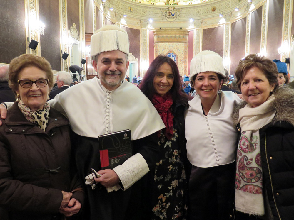 The ceremony was presided over by the University’s Rector, Dr. Carlos Andradas, and was dressed in all the pomp and solemnity typical of this kind of academic event, extending over a period of approximately two hours. The new Doctors (PhD), dressed in togas, mucetas and puñetas according to the each Faculty’s colour (white in the Fine Arts case), white gloves and with the cap in hand, we approached one by one to the platform where the Rector imposed it to us and, giving us the embrace of welcome, he received us in the University Cloister. Afterwards, we were presented with the “Book of Wisdom”, and the Fine Arts Faculty’s Dean, Dr. Elena Blanch González, gave us the corresponding welcome hug.